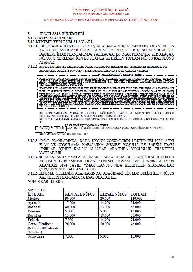 1 Numaralı Cumhurbaşkanlığı Teşkilatı Hakkında Cumhurbaşkanlığı Kararnamesi’nin 102 nci maddesinin birinci fıkrasının (c) bendi uyarınca Bakanlığımızca 28.10.2025 tarihinde onaylanan Sinop- Kastamonu- Çankırı Planlama Bölgesi 1/100.000 ölçekli Çevre Düzeni Planı değişikliği (8.1.1.2 no.lu plan hükmünün yer aldığı 20 no.lu sayfası ve Plan Değişikliği Gerekçe Raporu) 12.11.2025 tarihinden itibaren geçerli olmak üzere 30 gün süreyle askıya çıkarılmıştır.